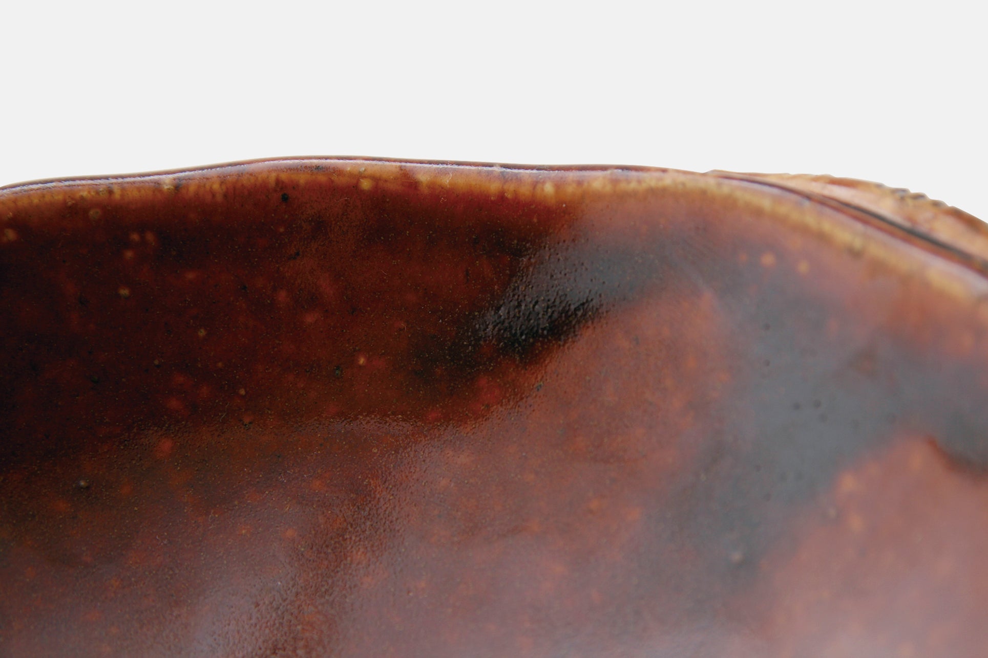 飴釉薬は、鉄分を多く含む釉薬で、焼成によって生まれる、とろりとした深みのある飴色が特徴です。その温かく、どこか懐かしい色合いは、食材を優しく包み込み、料理をより一層美味しそうに引き立てます。光沢があり、しっとりとした質感は、手にした時の心地よさも魅力の一つ。和食はもちろん、洋食やデザートなど、様々な料理に合わせやすく、食卓に豊かな表情と温もりを添えてくれます。