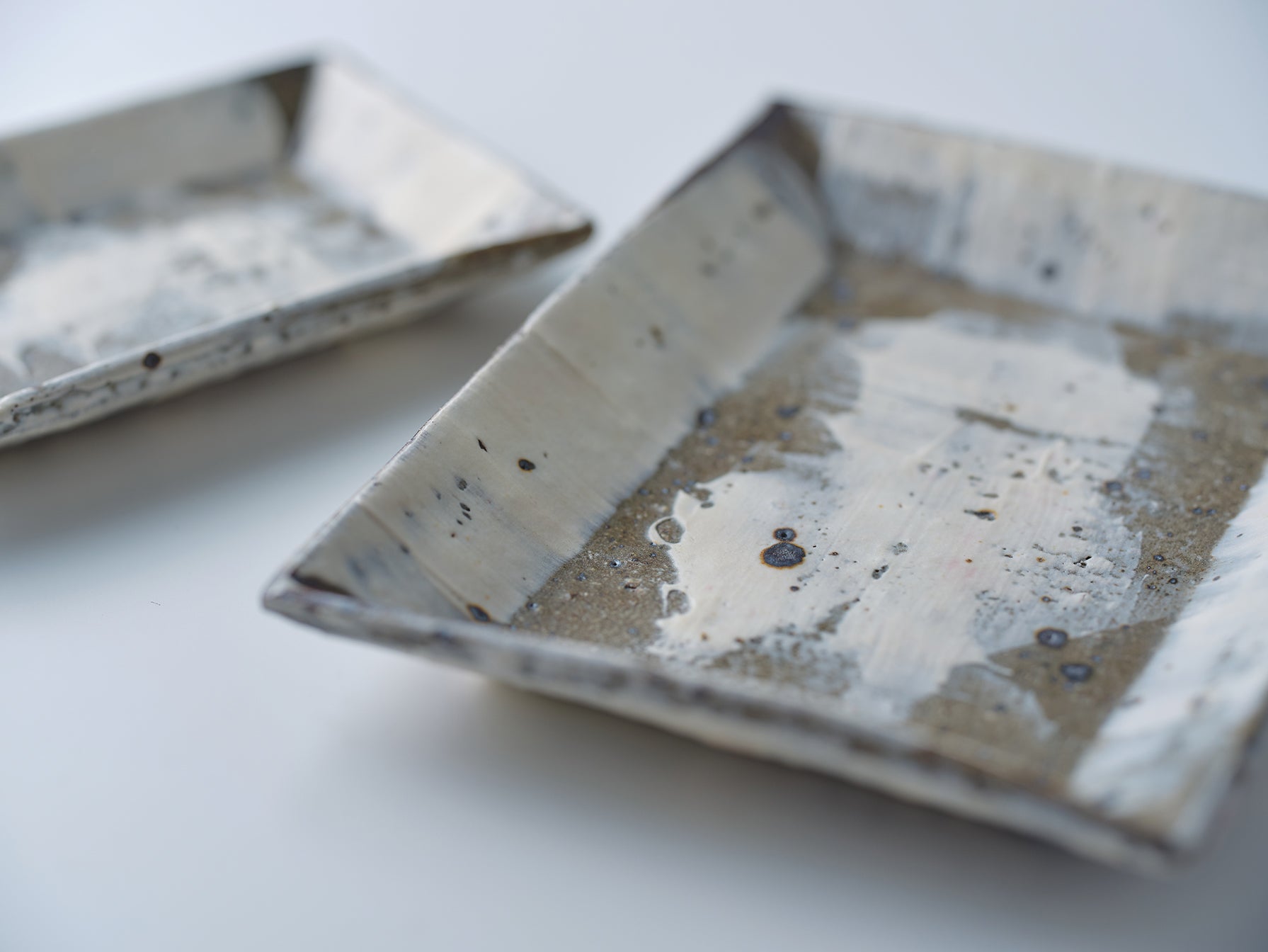 荒戸白刷毛目は、灰釉素地に白化粧土の勢いある刷毛目がデザインされた装飾。落ち着いたグレーの灰釉に、大胆な白の刷毛跡が温かみと手仕事感を添えます。角皿のシルエットと調和し、料理を引き立てるのが特徴。素朴ながらもモダンな印象を与える技法です。