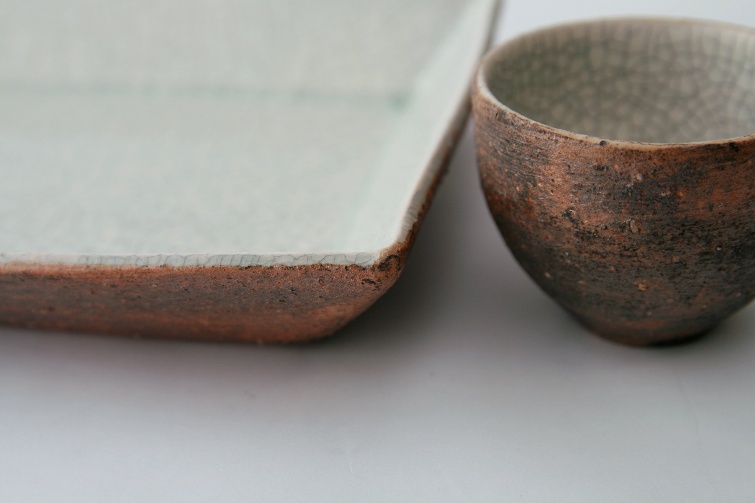 泥ビードロ釉は、素地の土味を生かした泥化粧と、透明感のある白ビードロ釉のコントラストが美しい釉薬です。化粧泥のざらりとした質感と、ビードロ釉の滑らかな質感が対比し、奥行きのある表情を生み出します。色目のある釉調が、落ち着いた中にも個性を感じさせる、大人のための佇まい。素朴さと洗練さが共存する、魅力的な釉薬です。