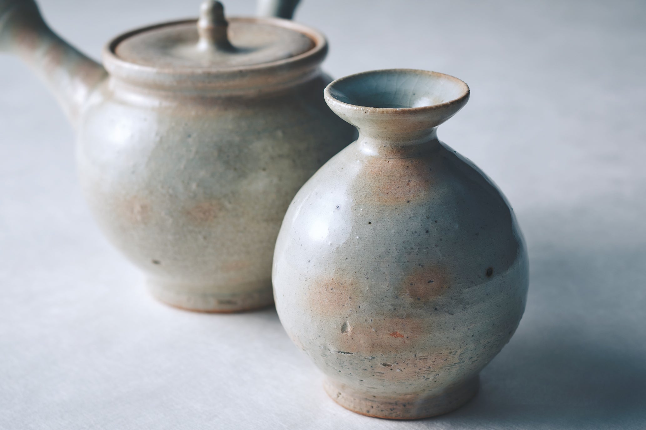 御本(ごほん)は、還元焼成された灰釉に見られる、桃色や紅色の斑点状の窯変です。これは、土や釉薬に含まれる鉄分が焼成中に変化することで生まれる独特の景色です。灰釉本来の素朴で温かみのある風合いに、御本の優しい赤みが加わることで、一点として同じものがない、深みのある表情が生まれます。