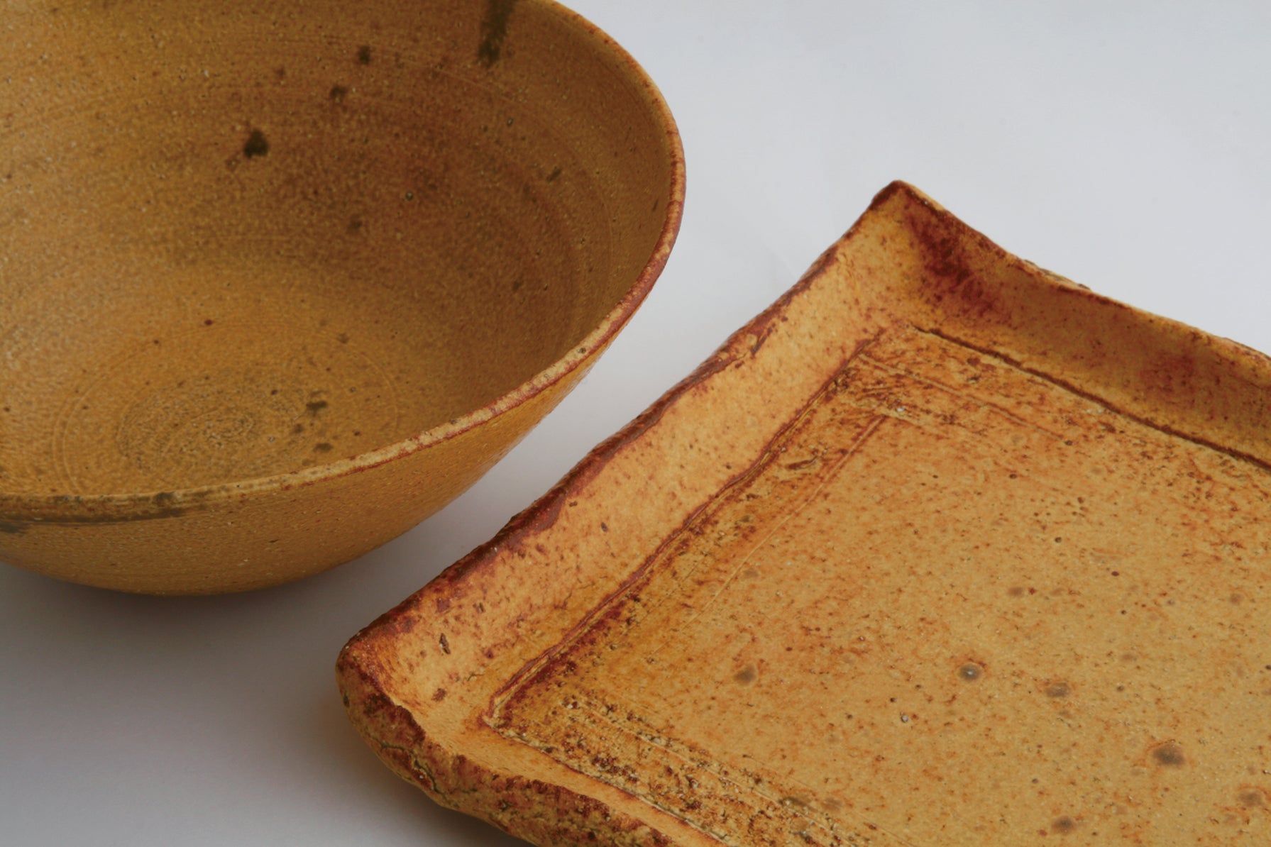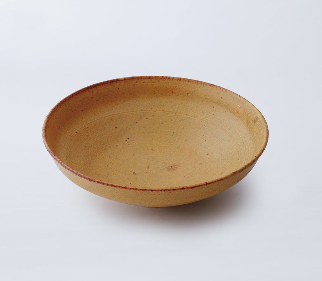 TOU黄伊良保釉は、還元焼成による鮮やかで深みのある黄色味が特徴。ざんぐりとした土の質感と鉄分の焦げ付き、窯変が奥行きある景色を生み出します。釉薬の薄い部分は剥げ、褐色に発色。珍しい黄色の発色ながらも、食材や料理を引き立てる力があります。素朴ながらも食卓を明るく彩る、魅力的な釉薬です。