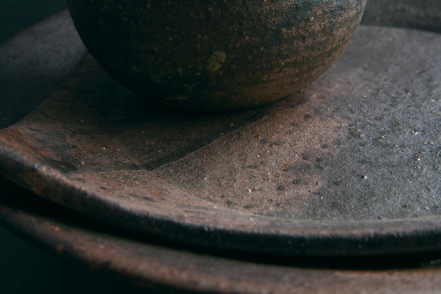 黒銀灰は、黒の中に銀色の粒子が煌めく、色気のある艶やかな表情が特徴の釉薬です。光の当たり具合によって、様々な表情を見せる奥深い色合いが魅力。落ち着いた色調ながらも、華やかさがあり、食卓にモダンで洗練された印象を与えます。陶器に独特の個性を与え、料理を引き立てるだけでなく、器そのものの美しさも楽しめます。大人の食卓にぴったりの釉薬です。