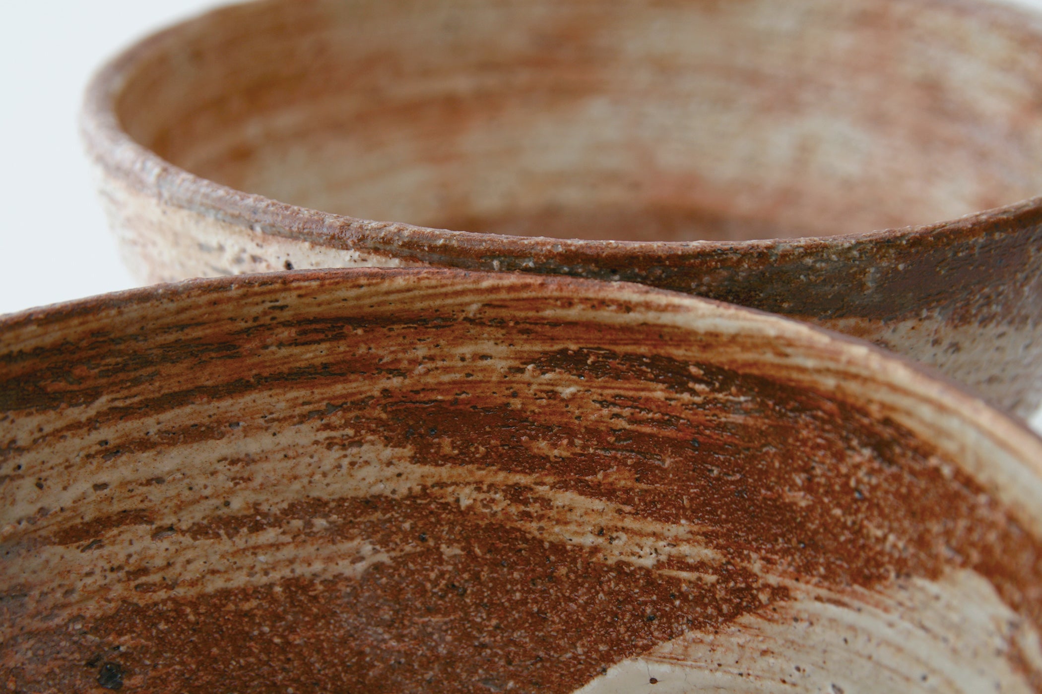 信楽の土味を活かした粉引の白荒刷毛目は、大胆な刷毛の白い化粧土が力強い表情。素地の鉄分が滲み出し、信楽の赤土が加わることで、複雑で奥行きある独特の景色に。素朴な中に、信楽焼ならではの土味と個性が際立つ風合いが魅力。筆の勢いと土の赤みが、温かくダイナミックな表情を生み出します。