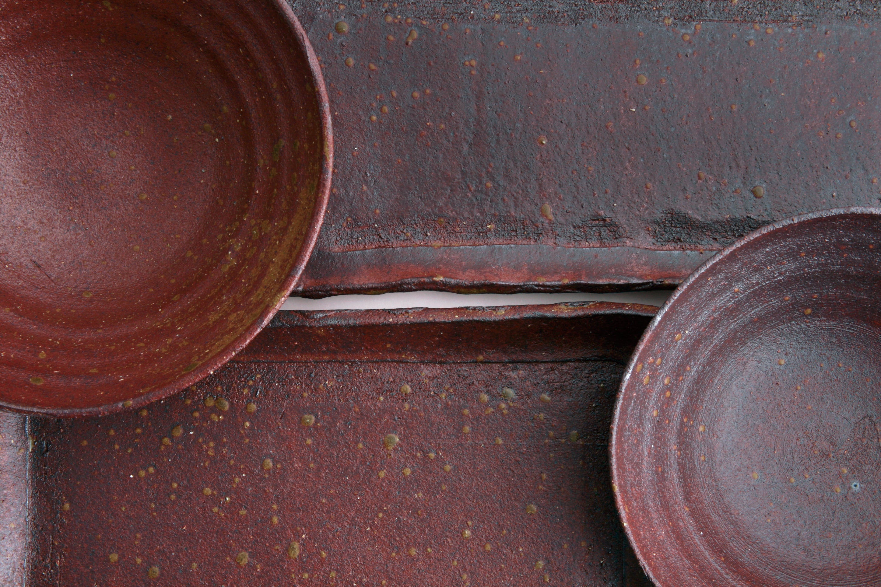 TOUの鉄赤釉は、光沢を抑えた控えめな赤色が、信楽の土味をダイレクトに伝える釉薬です。焼き上がりには、ところどころに金色調の斑紋が現れ、素朴な表情に豊かなアクセントを加えます。鉄分が生み出す深みのある赤褐色と、土の温もりが調和し、食材の彩りを引き立てます。侘びた風合いの中に、さりげない華やかさが感じられる、味わい深い魅力を持っています。