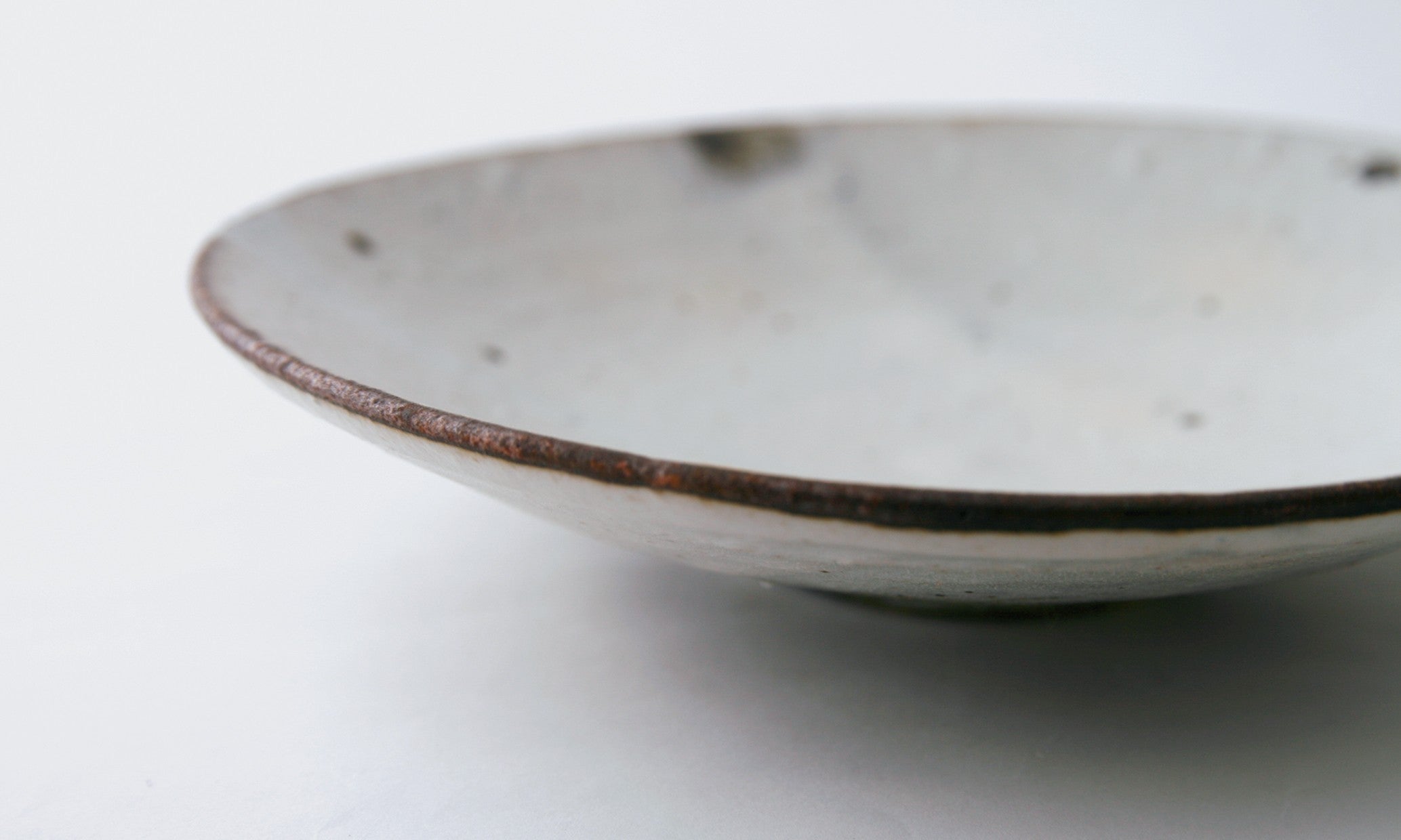 鉄巻粉引釉は、白い粉引の柔らかな表情に、鉄分の焦げ付きによるシャープなラインがアクセントとなる釉薬です。粉引の温かみと、鉄の力強さが調和し、モダンでありながらも素朴な風合いが魅力。鉄の濃淡や、粉引とのコントラストが、一つひとつ異なる景色を生み出します。食材の色を引き立て、食卓に豊かな表情と奥行きを添える、味わい深い釉薬です。
