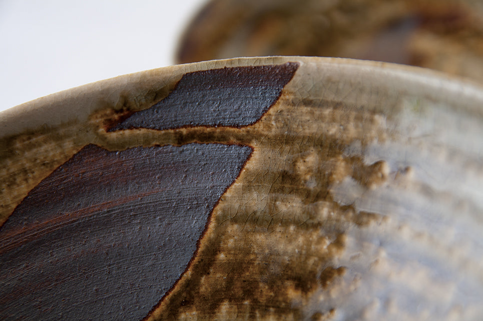 伝統的なビードロ釉薬と鉄釉。熟練の職人による緻密なかけ分けが生む複雑な表情。落ち着いたビードロの雰囲気と鉄釉の深みが織りなすコントラストが魅力的です。意図的な「抜け感」から覗く緋色の温かみと素朴さが加わり、手仕事ならではの、一つとして同じものはない景色が楽しめます。