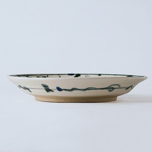 白地に大胆な呉須(ごす)の藍色が映える、信楽焼の8寸皿です。職人の手によって一枚一枚丁寧に描かれた絵柄は、力強くも温かみがあり、食卓に豊かな表情を与えます。約25cmの堂々としたサイズは、メインディッシュや盛皿として存在感を放ちます。手書きならではの筆の勢いや濃淡が、料理をより一層引き立て、特別な食卓を演出してくれるでしょう。