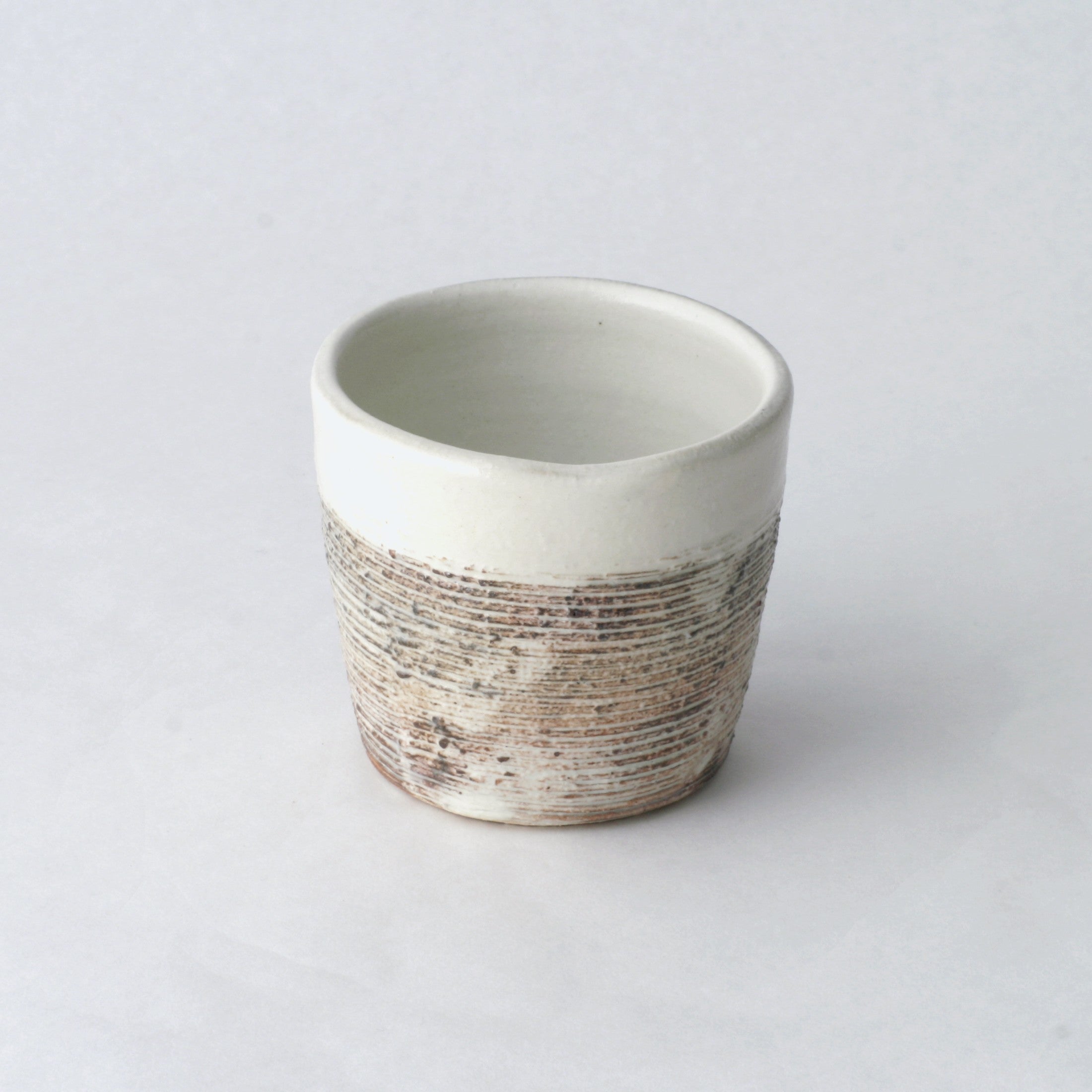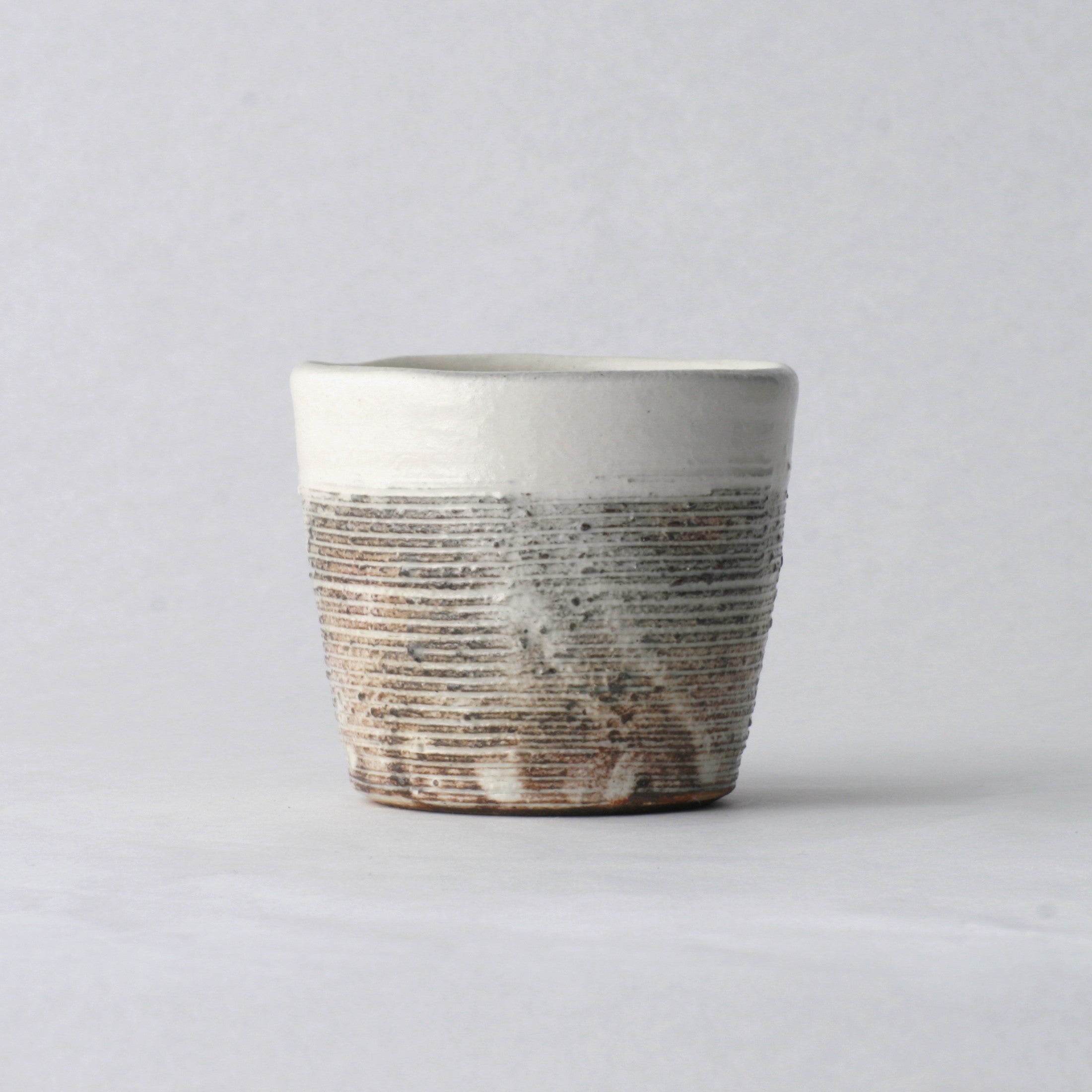 渕の素朴な風合いと、横に施された櫛目が温かみを添えるフリーカップです。焼酎ロックをじっくりと味わうのはもちろん、冷たいアイスクリームをたっぷりと楽しむのにもぴったり。その名の通り、使う人のアイデア次第で、様々な用途に使えるのが魅力です。手にしっくりと馴染む太めのフォルムは、安定感があり、普段使いにも最適。あなたのリラックスタイムに、さりげないこだわりと温もりを添えてくれるでしょう。