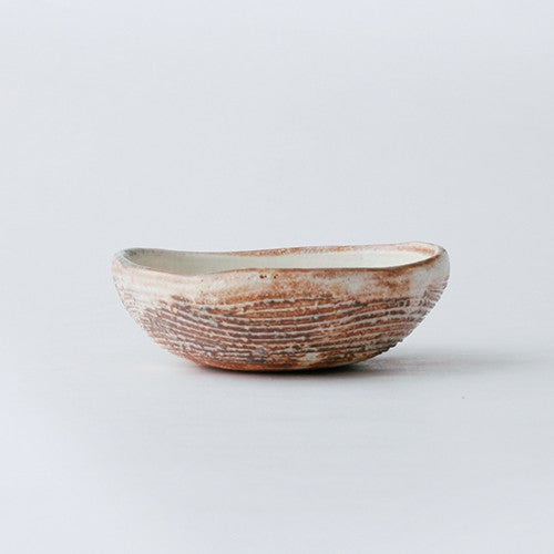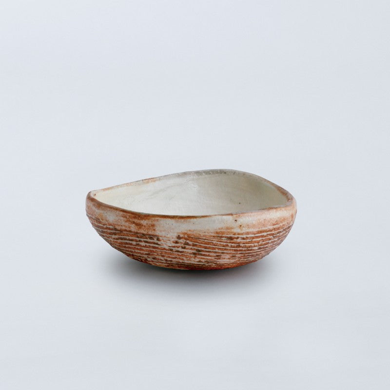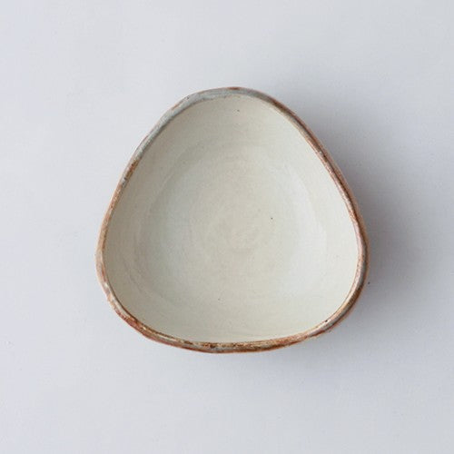 渕の素朴な風合いと、横に施された櫛目が温かみを添える三角豆鉢です。手のひらにちょこんと乗る可愛らしいサイズで、取り皿として、また、ちょっとしたおつまみや薬味を盛り付けるのにぴったりです。いくつか揃えて食卓に並べれば、統一感がありながらも、そのユニークな形が会話のきっかけにもなりそうです。普段の食卓に、さりげない可愛らしさと温もりを添えてくれる器です。