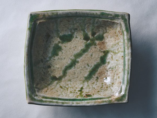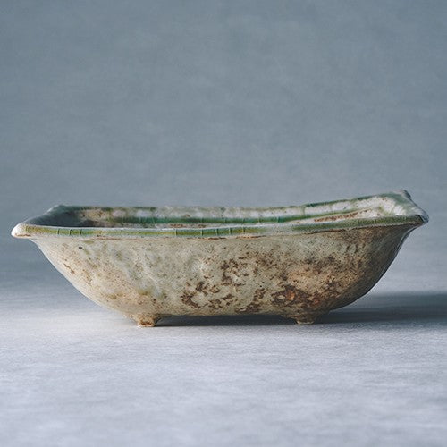 深みのある緑灰色と、透明感のあるビードロ釉が織りなす景色が美しい角鉢。煮物やサラダ、メインディッシュなど、様々なお料理を引き立てます。手仕事ならではの歪みや貫入が、味わい深い表情を添えます。食卓に豊かな彩りと、温もりを届ける一点です。