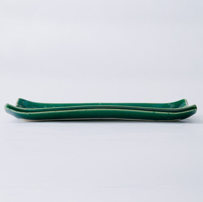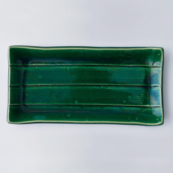 鮮やかな織部釉の緑が美しい、スタイリッシュな長角皿です。約w23cm × d12cmの使いやすいサイズは、焼き魚や前菜、お刺身などを上品に盛り付けるのに最適です。施された直線的なしのぎ模様が、モダンな印象を与え、食材の色をより一層鮮やかに引き立てます。食卓に洗練された彩りを添えてくれる一皿です。