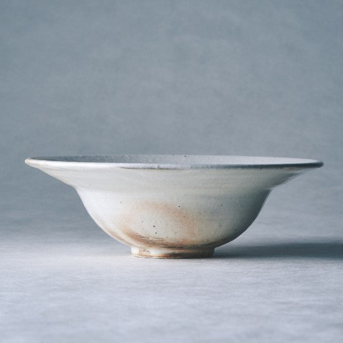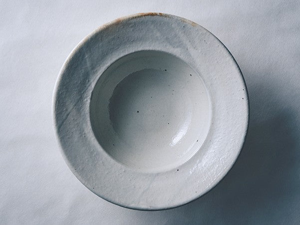 鉄の粒子が散ったような景色が味わい深い、鉄散粉引のリムボウルです。粉引の持つあたたかく優しい白は、どんなお料理もふんわりと包み込み、食卓に穏やかな雰囲気をもたらします。パスタやシチューなど、汁気のあるお料理も上品に盛り付けられ、リムの部分が持ちやすく、食卓での使いやすさも魅力です。日々の食卓にそっと寄り添い、長く愛用したくなるような器です。