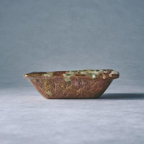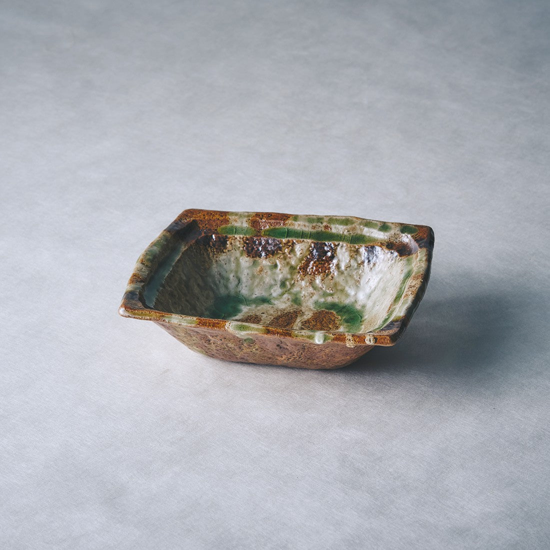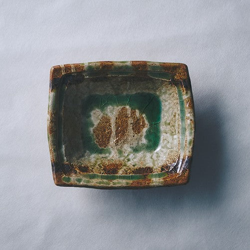 副菜にちょうどいいサイズの角豆鉢は、酒の肴や繊細な和物の盛り付けに最適。鉄と灰が生む深みあるエメラルドグリーンのような色合いと、一点ごとに異なる鉄描きの表情が魅力で、飽きさせません。小ぶりながらも鮮やかな存在感で、食卓に豊かな彩りを添えます。