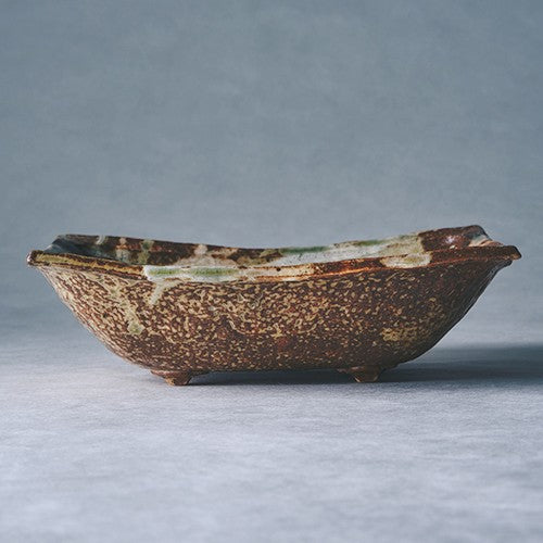 溜まりの美しいグリーンと鉄描きの力強い表情が魅力。深さがあり煮物からサラダまで幅広く活躍し、お造りなどを盛り付けるだけで、食材そのものの美しさを引き立て、食卓を豪華に演出します。飾り気は不要。素材の良さを際立たせる、存在感のある器です。